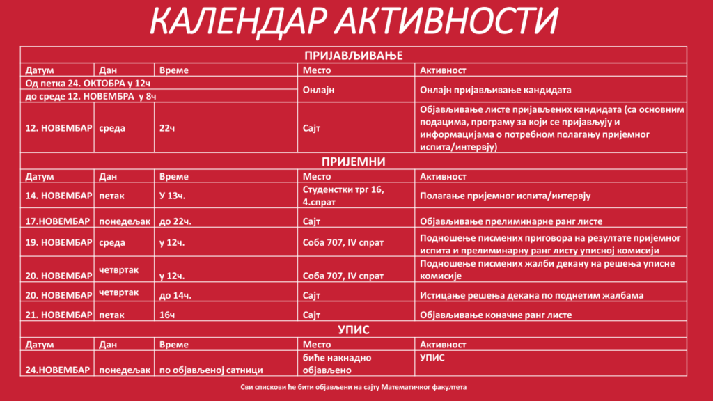 За све информације у вези са уписом можете нам писати на адресу upis@matf.bg.ac.rs или нас позвати на број 064/828-40-76 од 10.30 до 15.30 часова сваког радног дана.