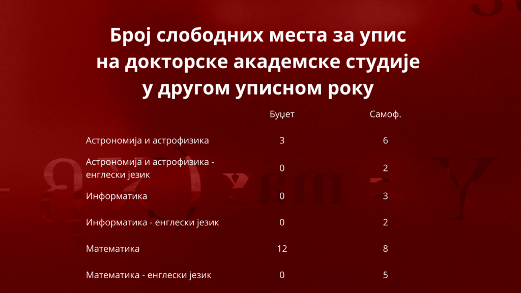 Математички факултет Универзитета у Београду објављује конкурс за упис кандидата на докторске академске студије у академској 2025/2026. години.